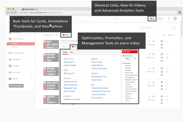 You can analyze your channel’s stats, get data on your videos, and perform competition research. You also can edit the thumbnails, annotations, and descriptions of your YouTube content.